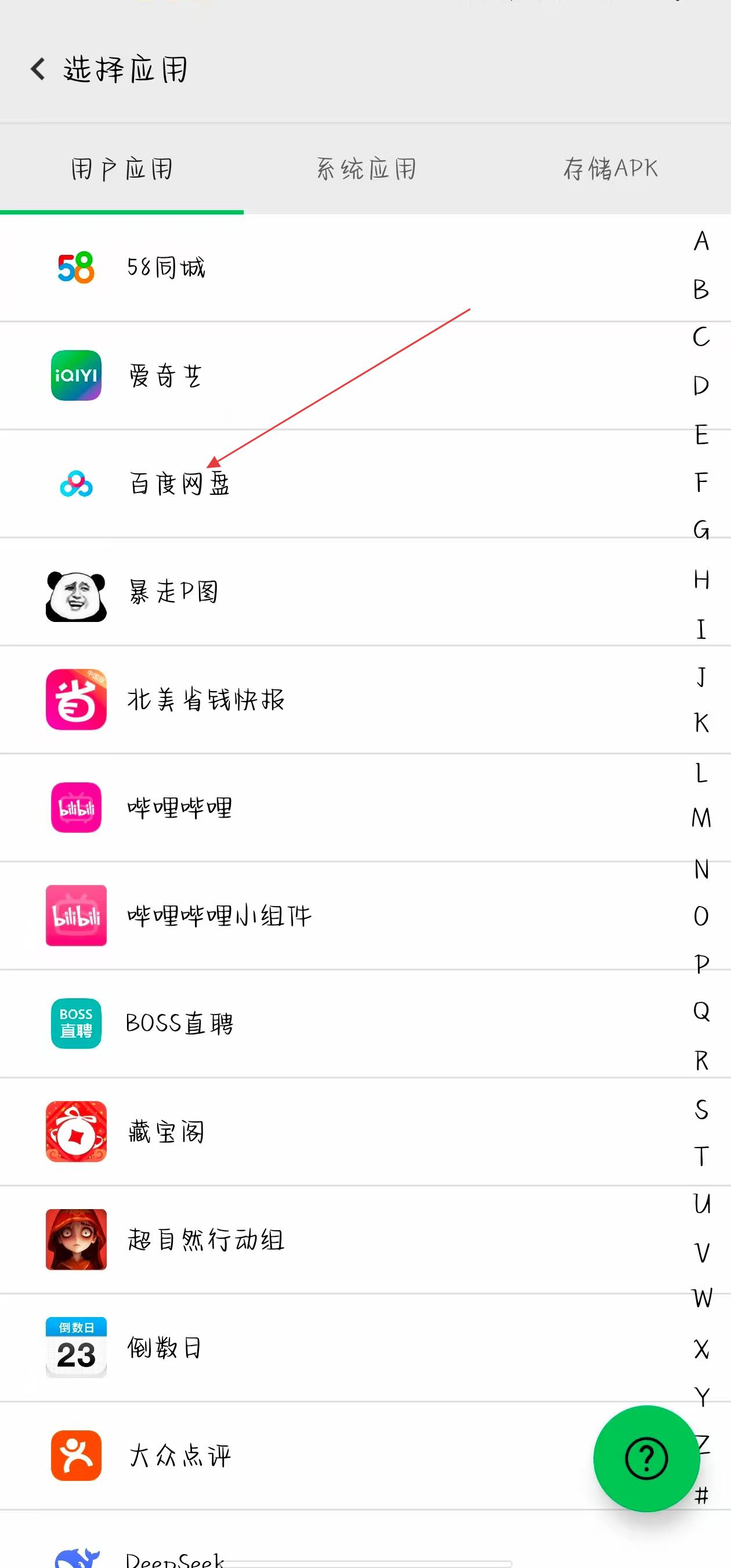 2、在选择应用页面,会展示用户手机中已安装的应用列表,在用户应用分类下找到想要添加分身的应用,比如百度网盘。