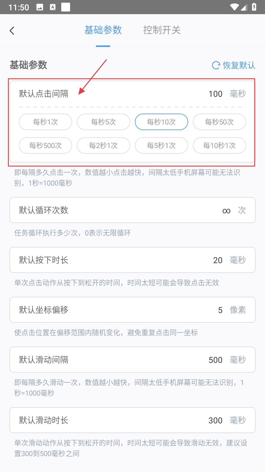 2、在设置页面的基础参数栏中,可设置默认点击间隔,还能设置默认循环次数。