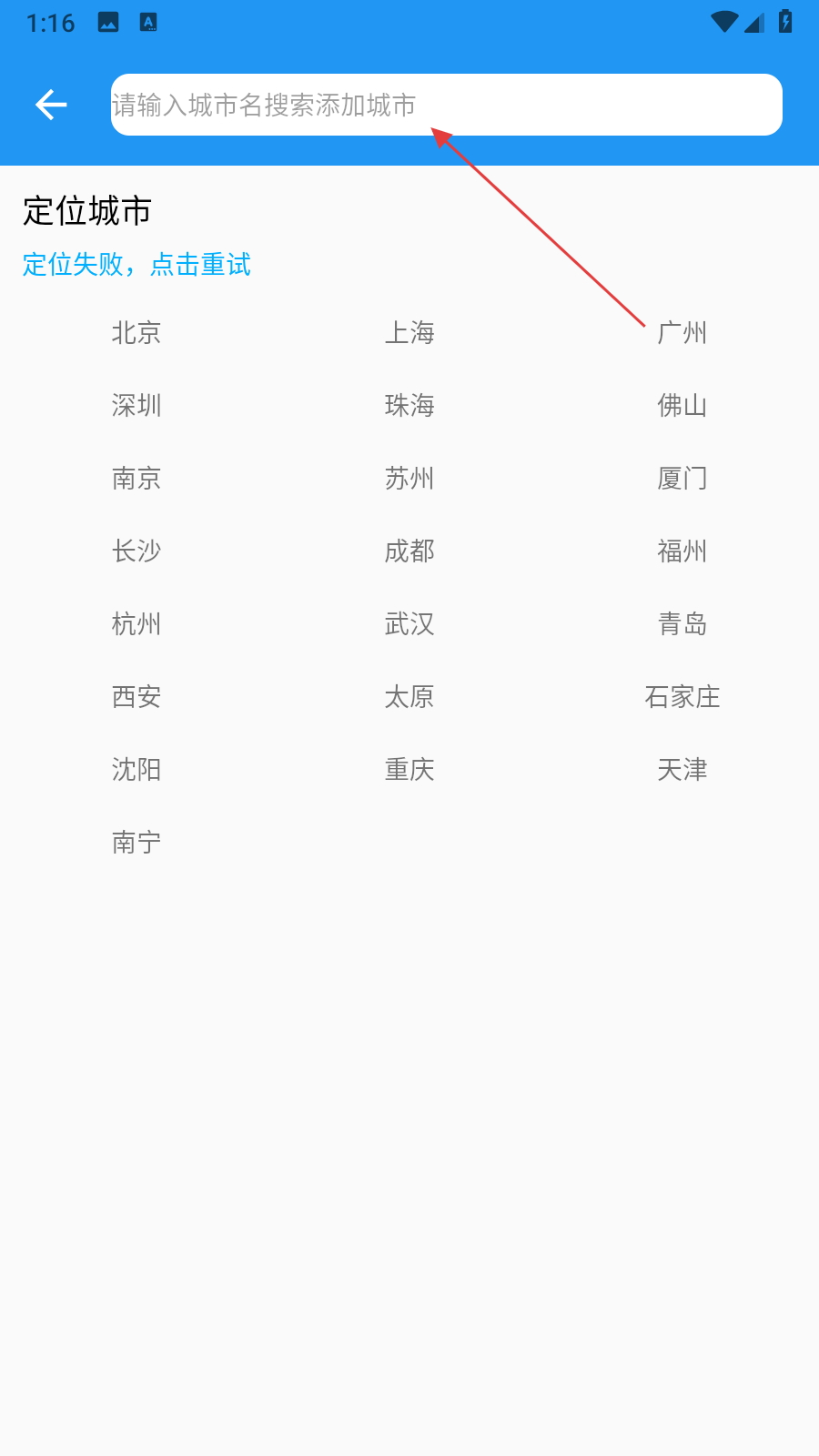 4、通过搜索框输入城市名或从推荐城市列表中选择目标城市,添加后返回天气预报页面即可查看该城市天气。