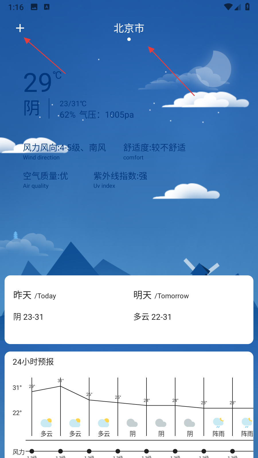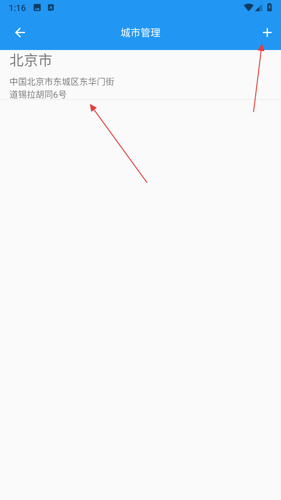 3、若需查看其他城市的天气预报,点击页面左上角的+号,进入城市管理界面,或者在城市管理界面点击右上角+号。