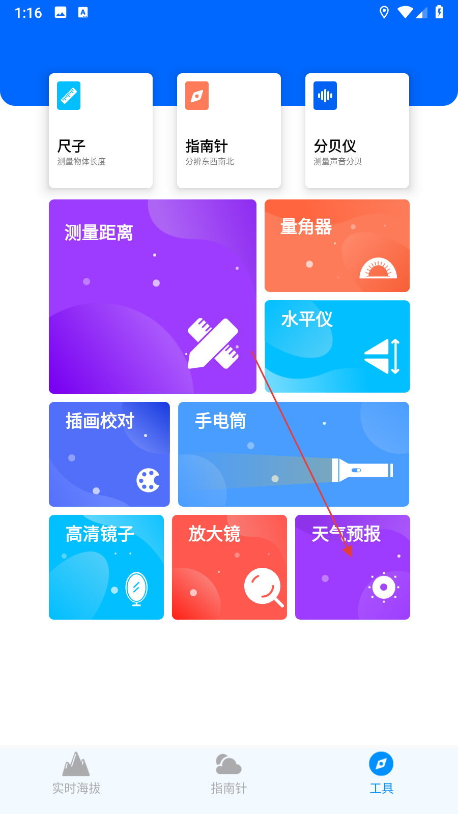 1、打开GPS海拔测量仪应用,在工具界面中找到并点击天气预报选项,进入天气预报页面。