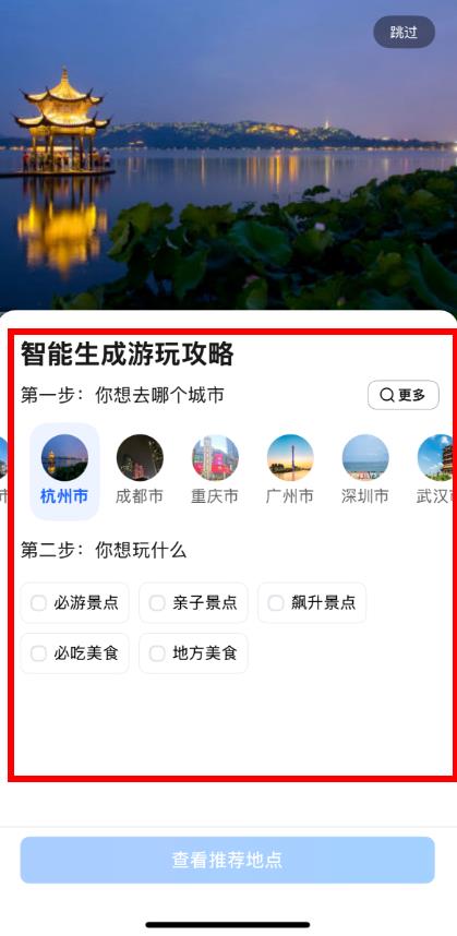 2、进入智能生成游玩攻略界面,第一步选择想去的城市,第二步选择想游玩的类型,比如必游景点、必吃美食等。