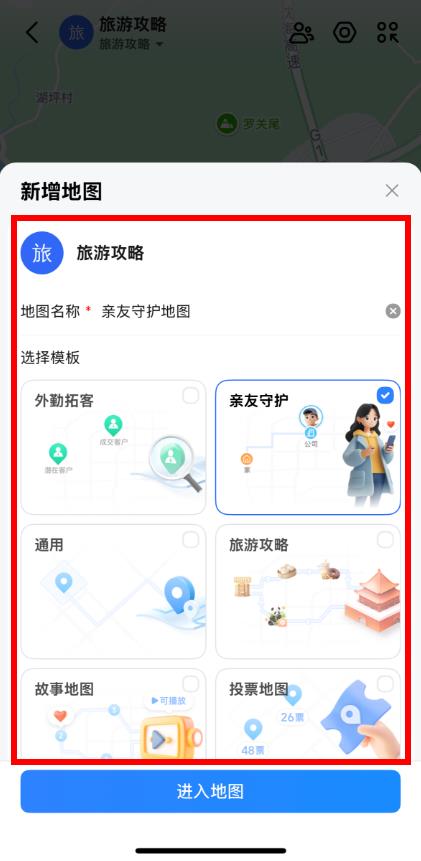 3、点击相关选项新增地图,自定义地图名称,选择模板如亲友守护、旅游攻略等,进入地图后进一步完善旅游攻略内容。