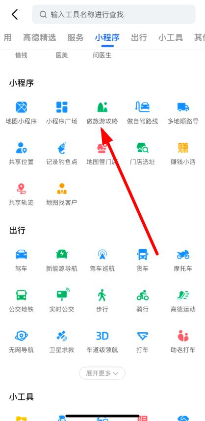 1、打开高德地图,点击我的,找到更多工具并点击,在小程序板块里选择做旅游攻略。