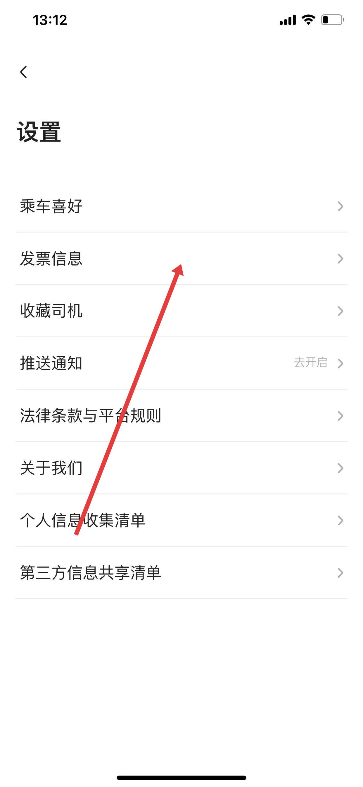 3、在设置页面里,点击发票信息选项 ,进入发票信息管理界面。