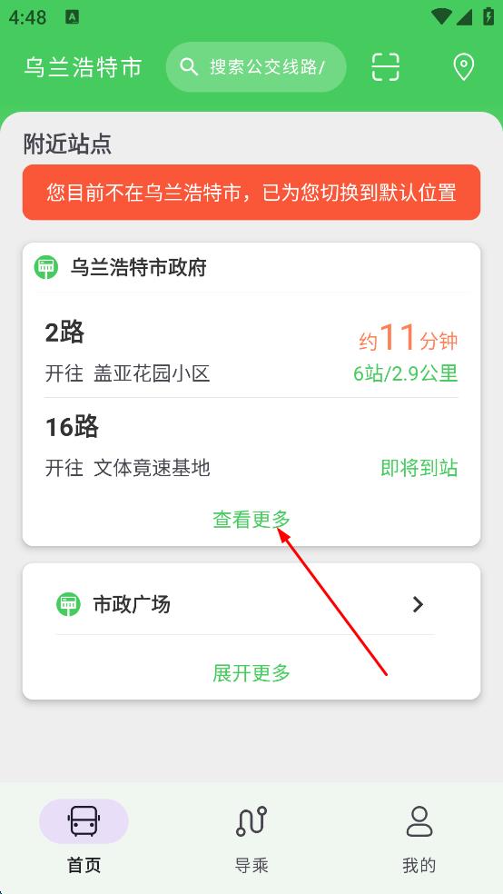 2、在公交查询页面,找到“附近站点”板块下的站点,在该站点显示的公交线路中,点击“查看更多”,找到公交并点击进入其详情页面。