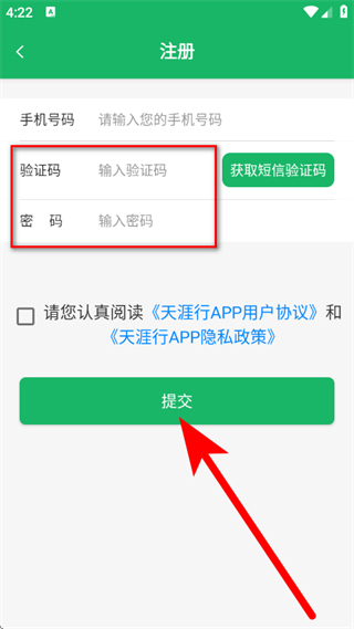 5、在输入框中,输入验证码,设置密码并勾选协议后,点击提交,完成注册。