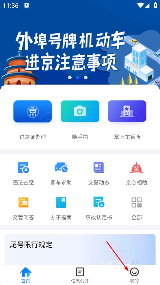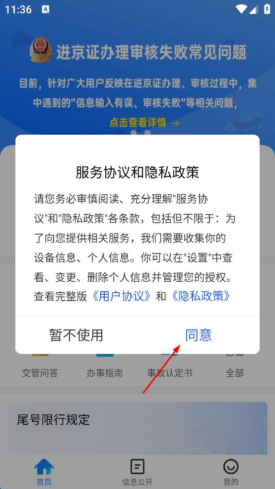 1、打开北京交管类APP,弹出服务协议和隐私政策提示,仔细阅读相关内容后,点击“同意”按钮,进入APP主界面。