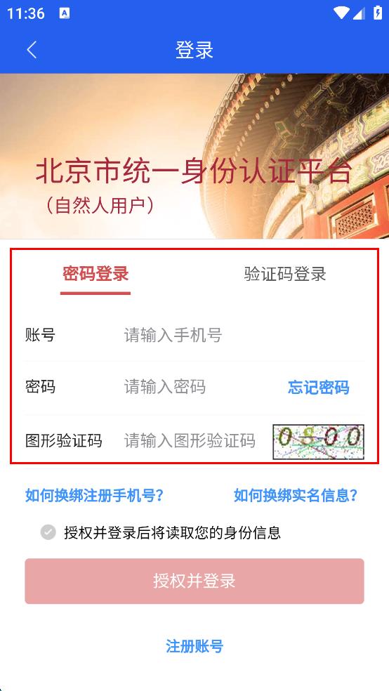 4、若选择密码登录,在登录界面输入手机号、密码以及图形验证码,确认信息无误后,点击“授权并登录”按钮,完成登录操作。