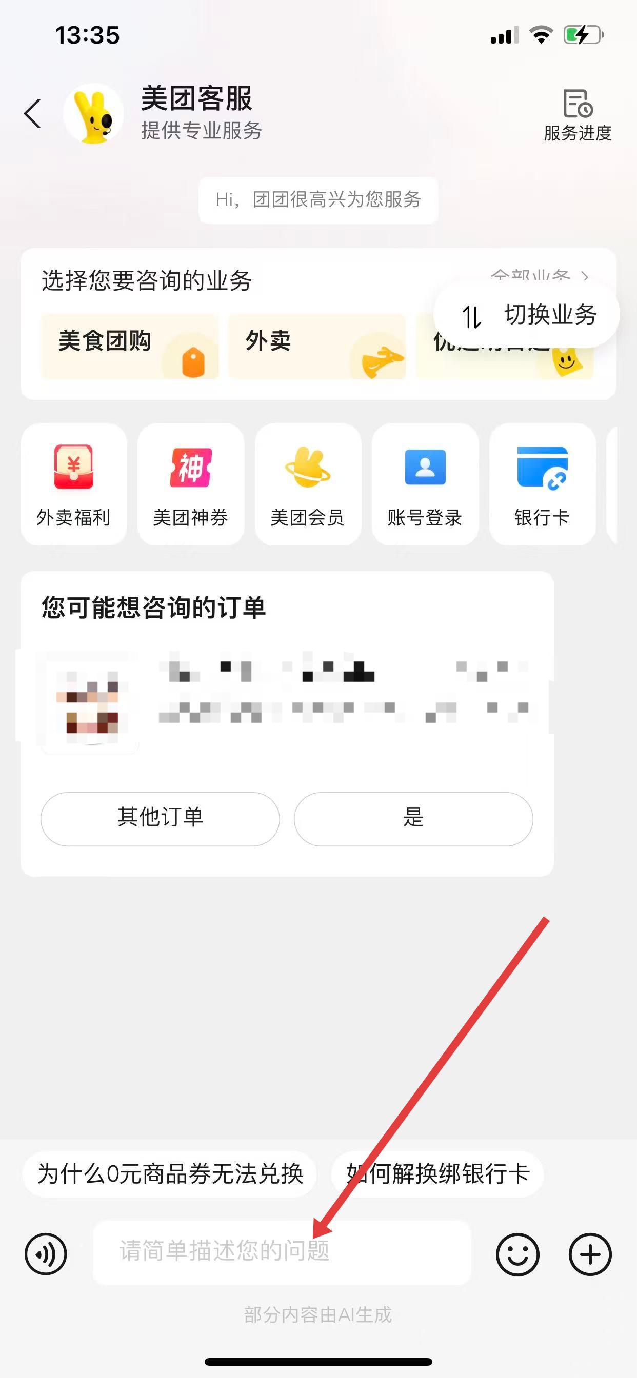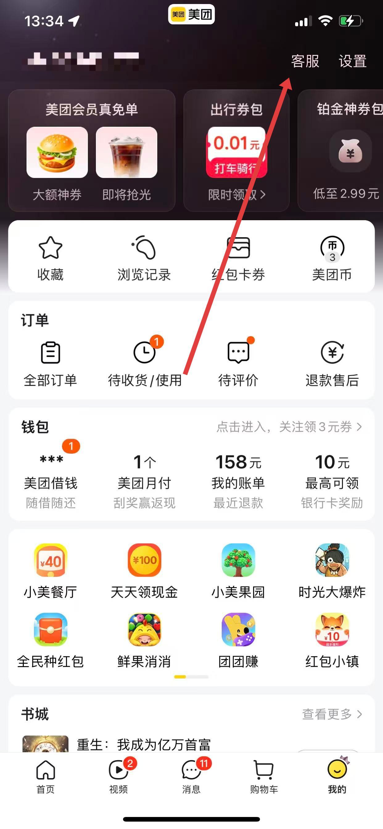 2、在个人中心页面,点击右上角的客服按钮,进入美团客服界面。