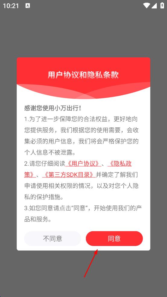 1、打开小万出行应用,在用户协议和隐私条款界面,点击同意,进入应用主界面。