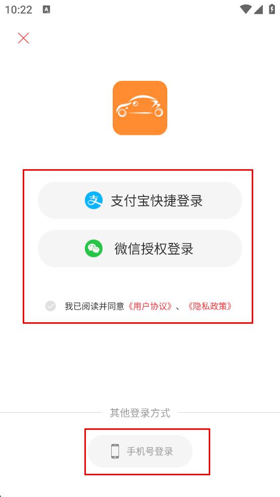 3、进入登录选择页面后,可选择支付宝快捷登录、微信授权登录或者手机号登录等方式,同时勾选“我已阅读并同意《用户协议》、《隐私政策》”。