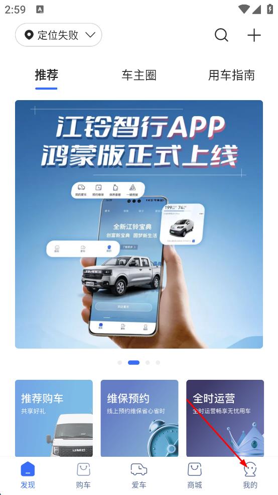 1、打开江铃智行APP,进入首页后,点击页面底部右侧“我的”选项,进入个人中心页面。