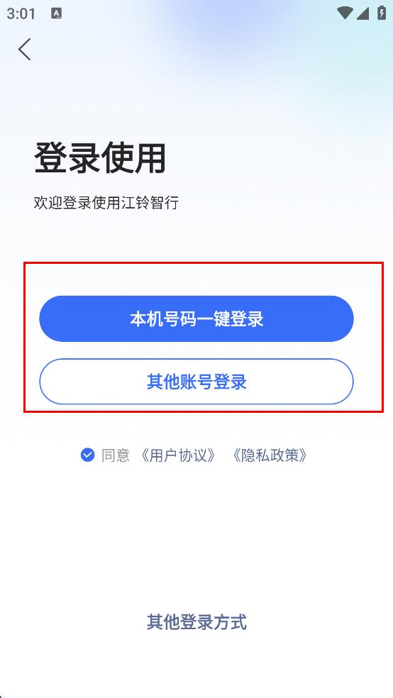 3、在登录使用界面,勾选同意《用户协议》《隐私政策》,然后选择“本机号码一键登录”或“其他账号登录”,按照提示完成登录流程,即可成功登录江铃智行APP。