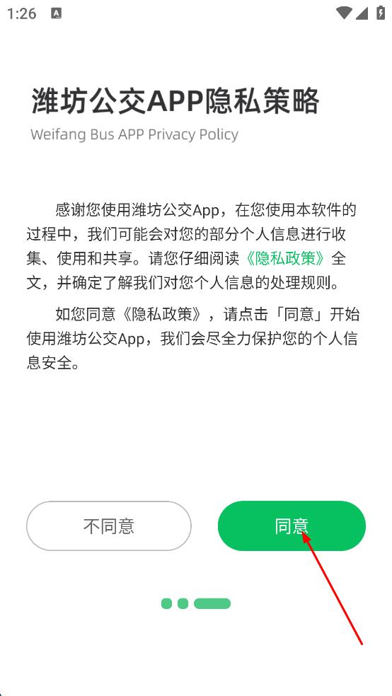 1、打开潍坊公交APP,在弹出的隐私策略界面,找到“同意”按钮,点击该按钮。
