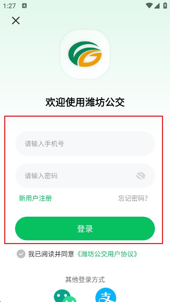 4、在登录界面中,在输入自己的手机号码,在“请输入密码”输入框中输入对应的密码,勾选我已阅读并同意潍坊公交用户协议前的圆圈,最后点击“登录”按钮,即可完成登录操作。