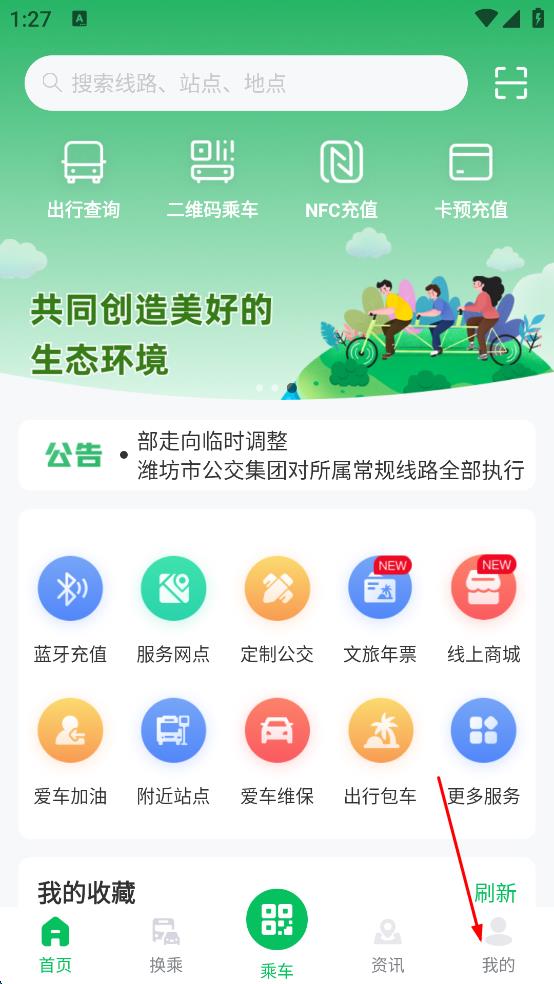 2、进入潍坊公交APP主界面后,在界面底部导航栏中找到“我的”选项并点击,界面会切换到个人相关页面。