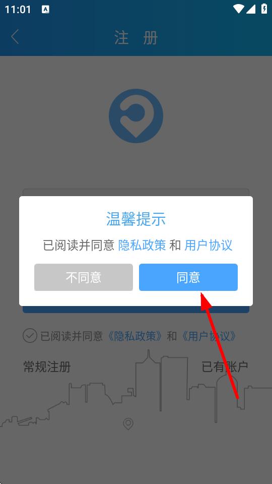 3、在弹出的温馨提示框中点击同意,确认已阅读并同意隐私政策和用户协议。