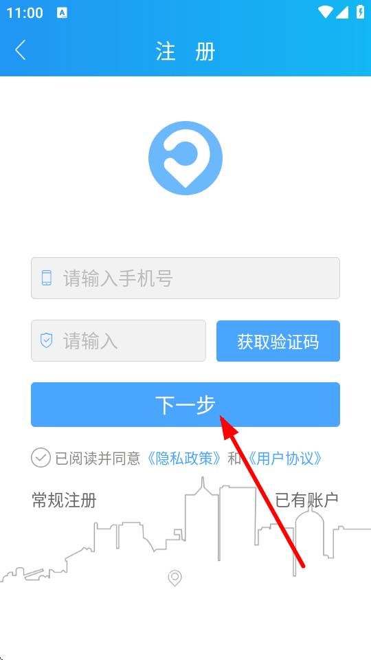 2、在注册页面输入手机号,点击获取验证码,输入收到的验证码后点击下一步。