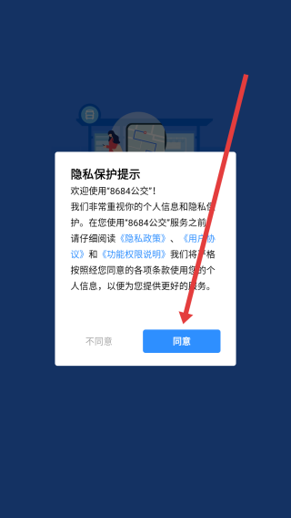 1、打开8684实时公交后,点击弹窗中的同意按钮,进入使用。