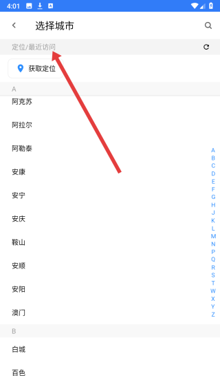 2、在进入到选择城市页面中,点击上方搜索栏输入要定位的城市。