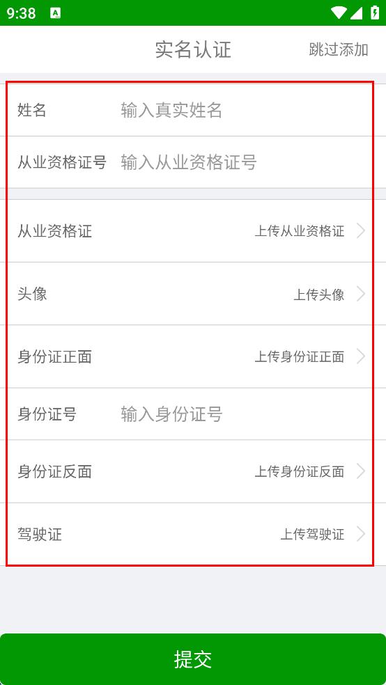 3、进入实名认证页面,依次输入真实姓名、从业资格证号,上传从业资格证、头像、身份证正面、身份证反面、驾驶证。
