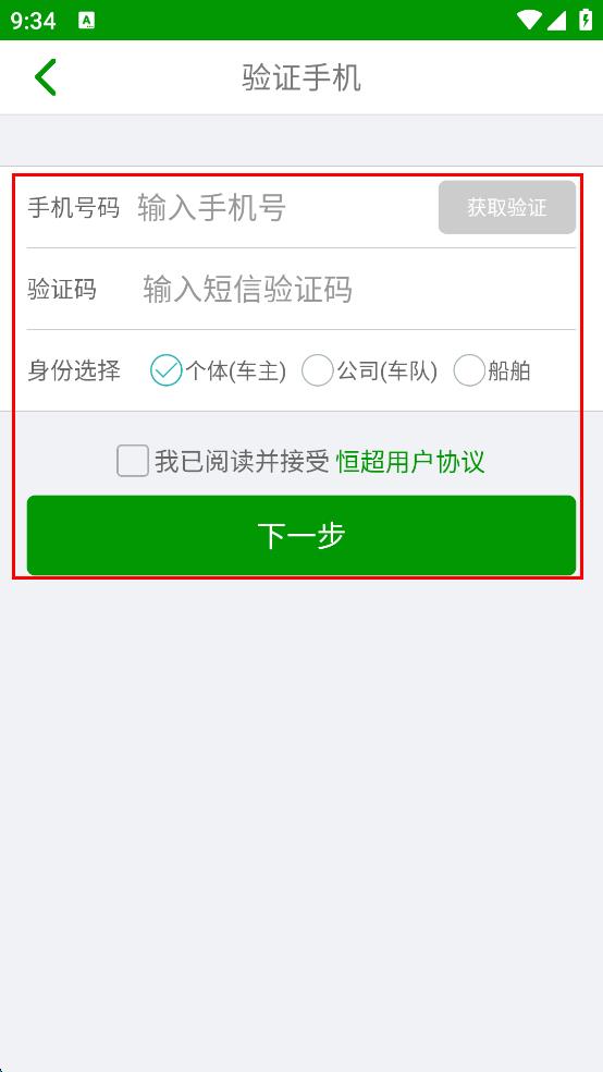 2、在登录界面点击注册,进入验证手机页面,输入手机号码,点击获取验证码,输入收到的验证码,选择身份,勾选已阅读并接受恒超用户协议,点击下一步。