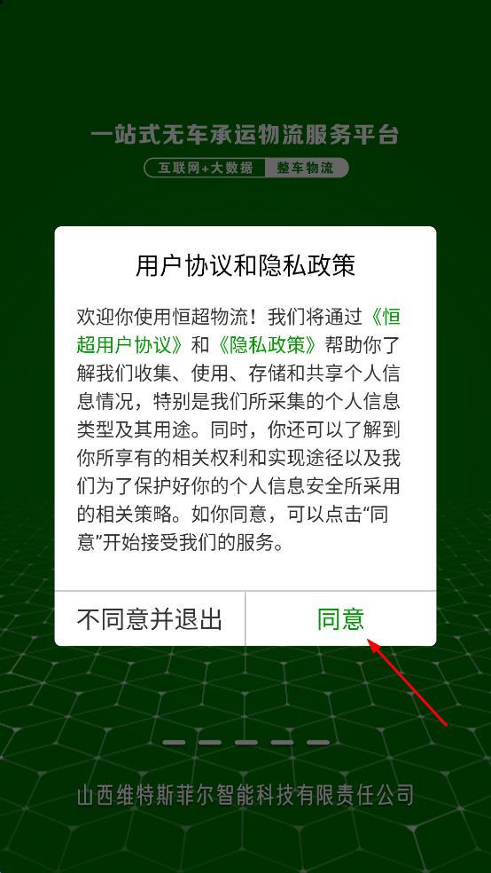 1、打开恒超物流,进入用户协议和隐私政策页面,点击同意,进入登录界面。