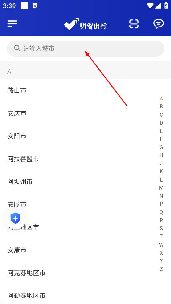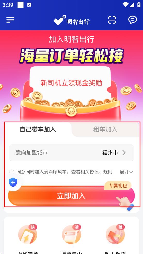 1、打开明智出行软件,进入“自己带车加入”页面,选择意向加盟城市,若当前显示城市不是目标城市,点击城市选择框,输入并选择目标城市。