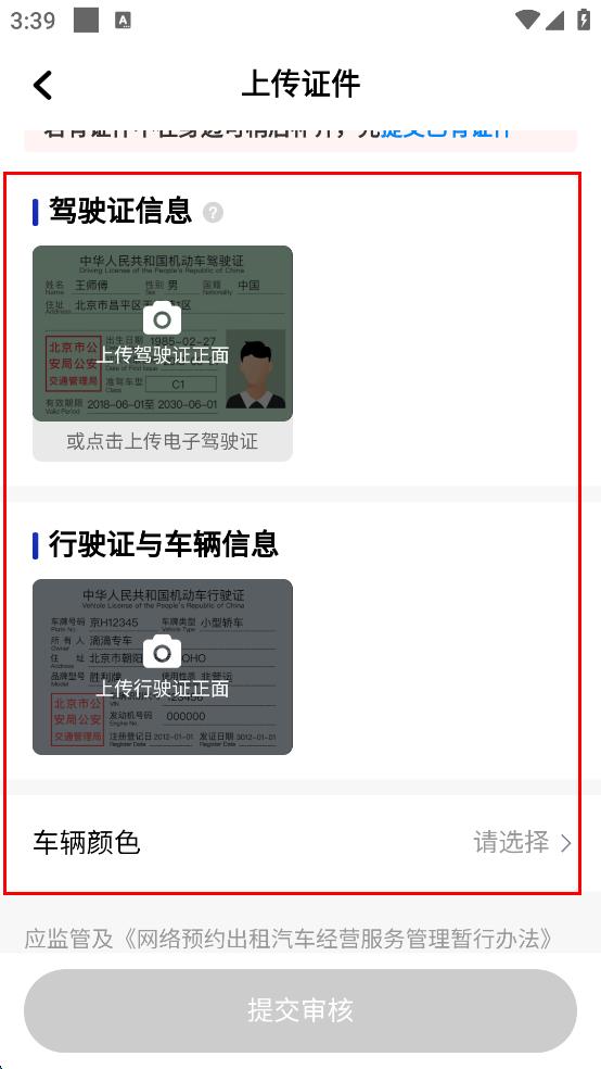 3、进入上传证件页面,按照要求,分别上传驾驶证正面以及行驶证正面,再选择车辆颜色等车辆相关信息。