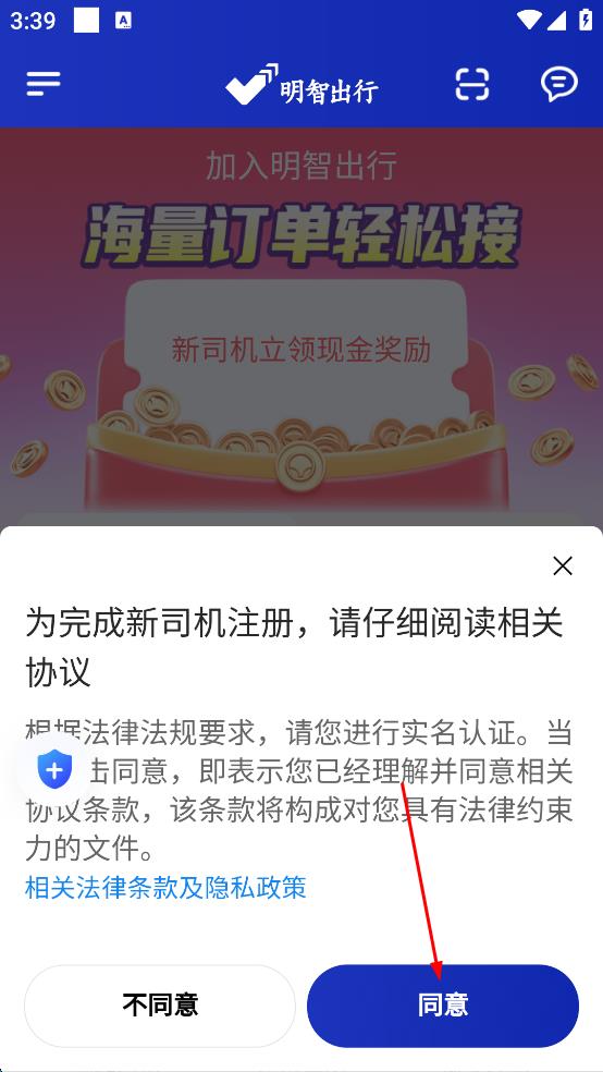 2、选择好城市后,会弹出新司机注册相关协议弹窗,仔细阅读协议内容,然后点击“同意”按钮,进入下一步。