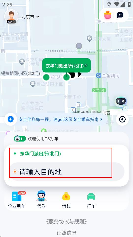 1、打开T3出行App,在主界面中,输入出发地和目的地。
