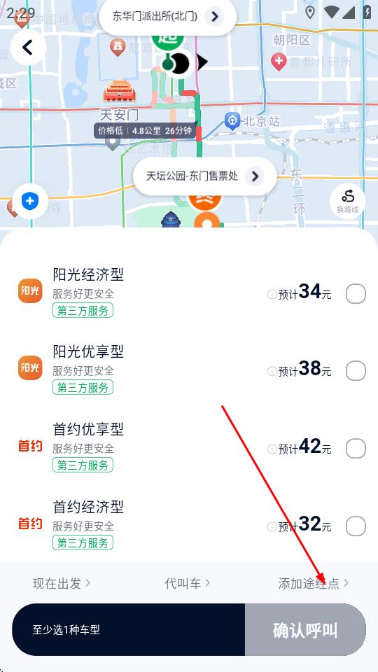 2、输入目的地后,点击叫车页面下方的添加途经点选项。
