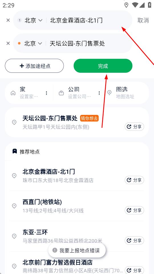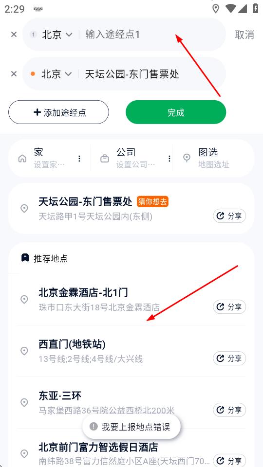4、输入或选择好途经点后,点击完成即可成功添加途经点。