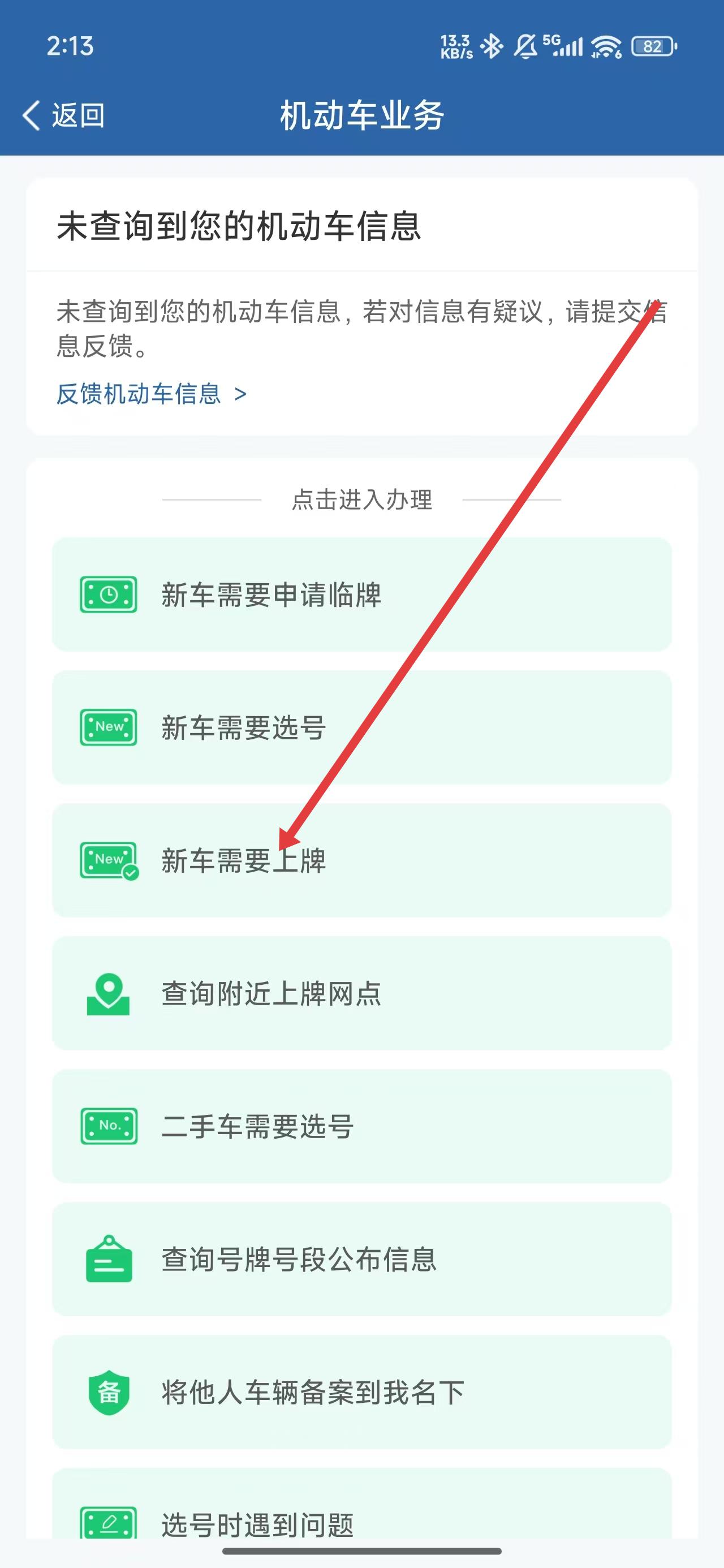 3、在进入到机动车业务页面中,点击新车需要上牌业务进行办理。