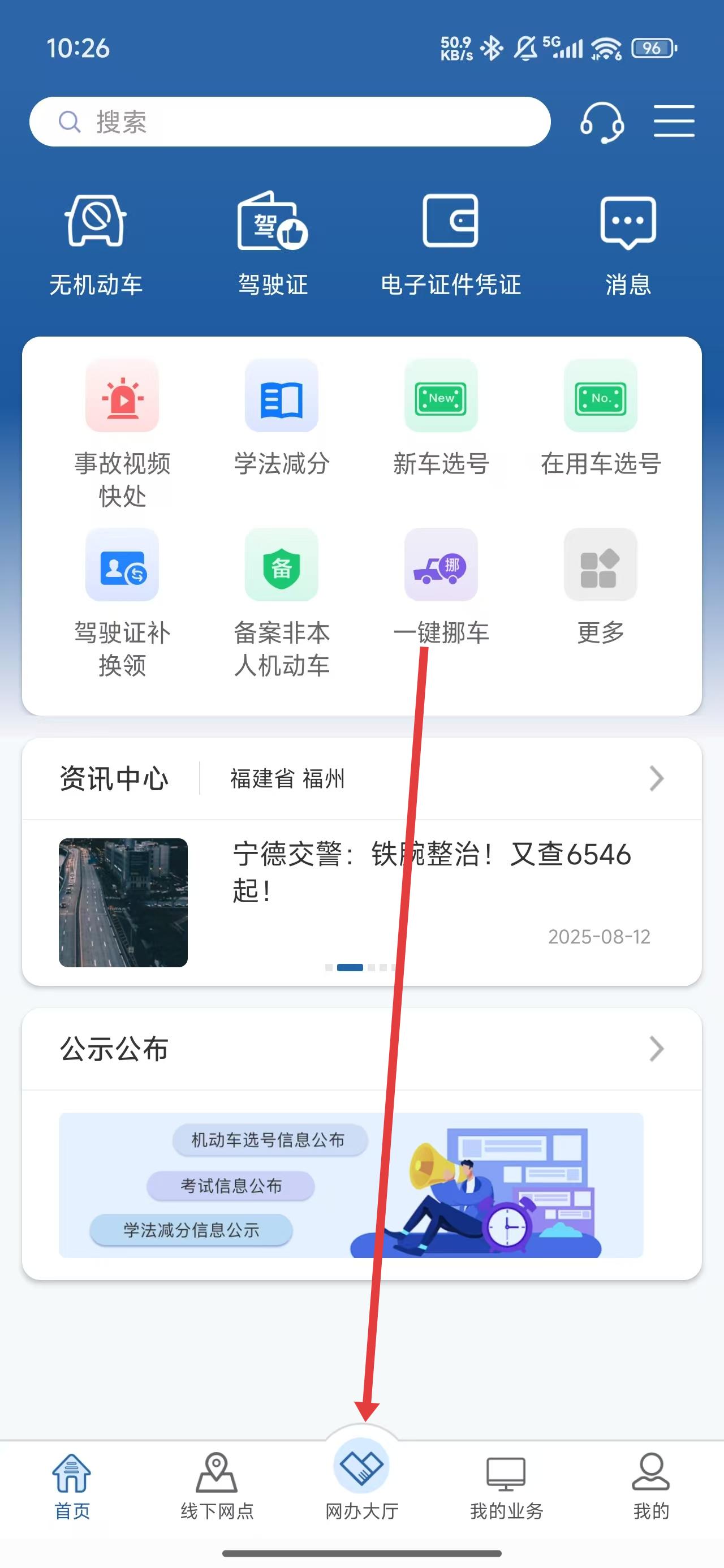 1、在App首页中,点击网办大厅按钮,进入查看更多业务信息。