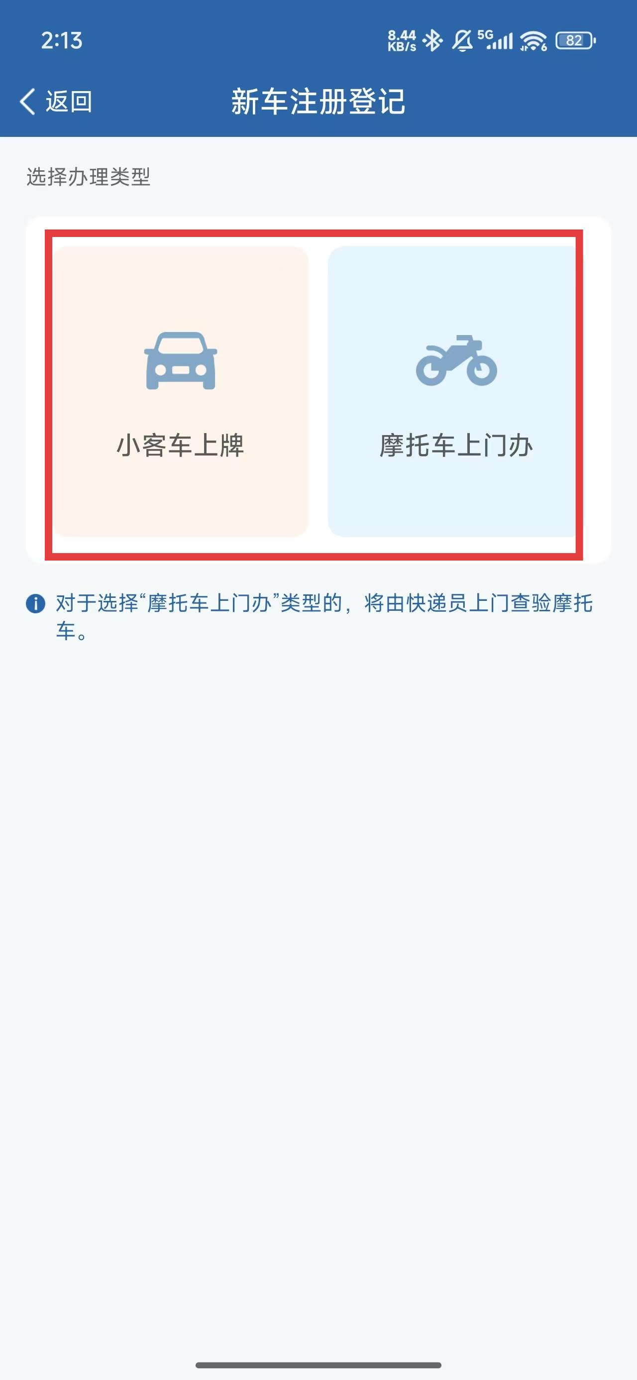 4、跳转到新车注册登录页面中,可以在下面两种机车类型选择登记。