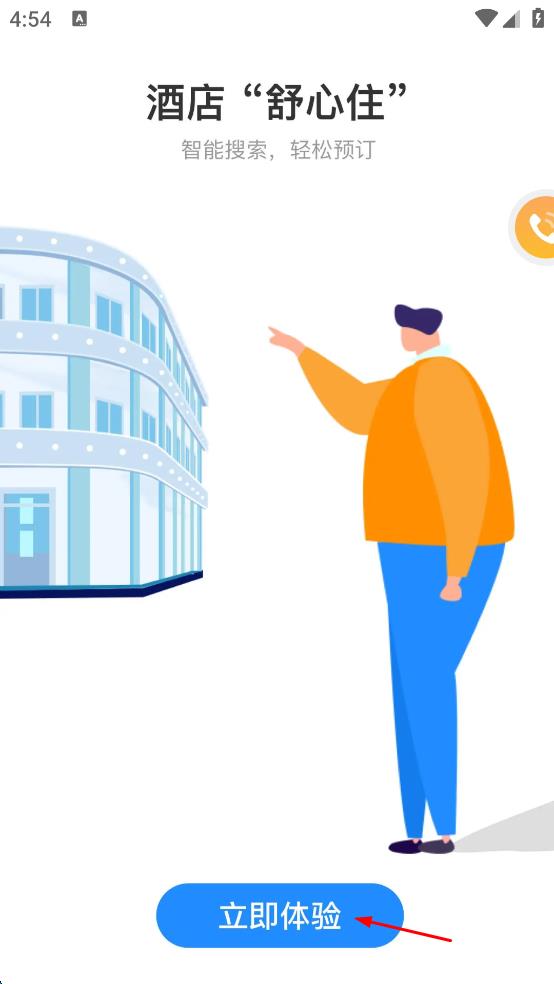 1、打开酒店预订软件,在展示“酒店‘舒心住’智能搜索,轻松预订”的页面,点击“立即体验”按钮,进入登录注册界面。
