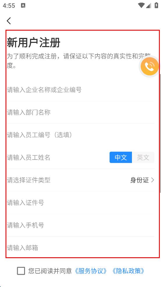 3、在新用户注册页面,依次输入企业名称或企业编号、部门名称、员工姓名等信息,选择证件类型并输入证件号,输入手机号和邮箱,阅读勾选同意协议,完成注册流程。