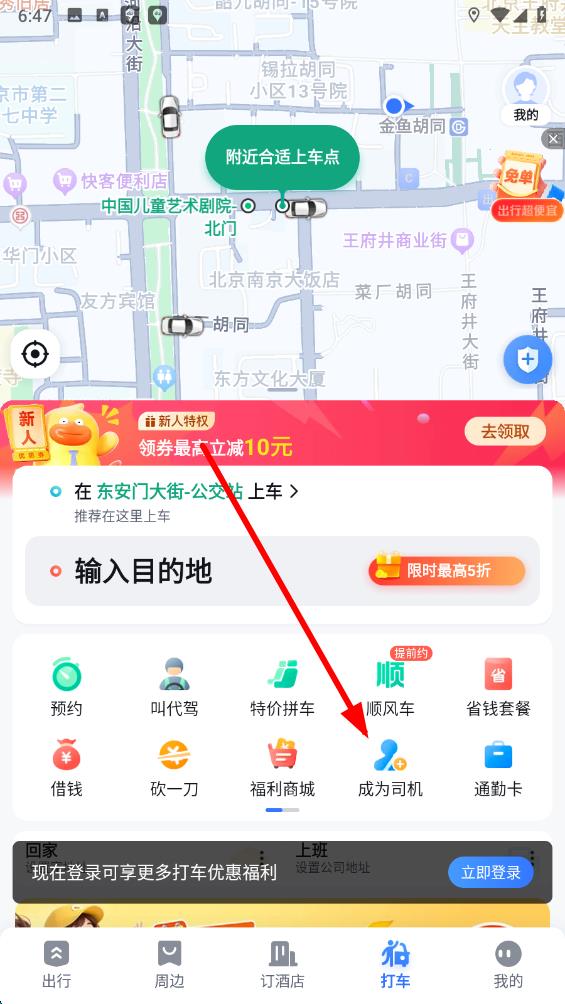 2、在打车界面里,找到并点击成为司机的按钮,进入司机注册相关页面。