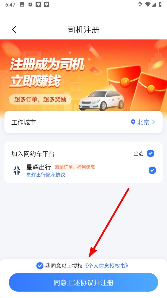 4、选择想要加入的网约车平台,勾选平台对应的隐私协议,最后点击同意上述协议并注册,按后续提示完成注册流程即可接单。
