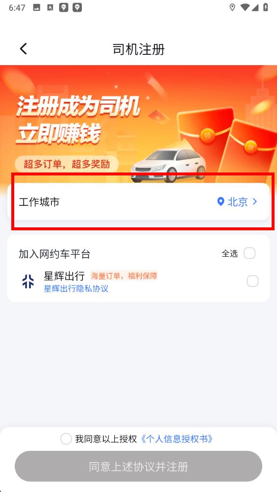 3、在司机注册页面中,首先点击工作城市选项,选择你计划接单的城市。