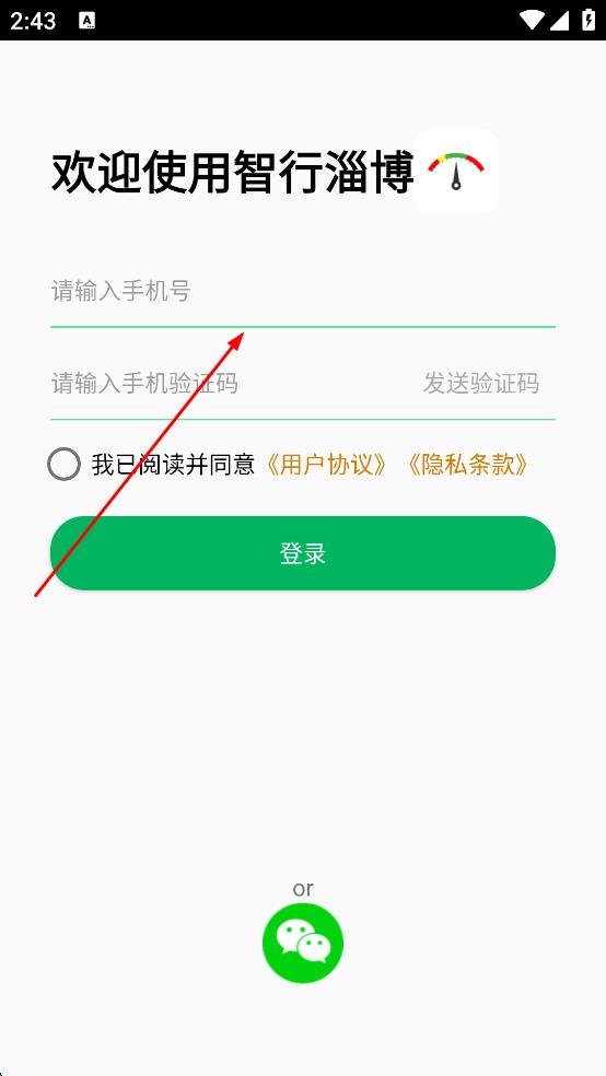 1、打开智行淄博应用,进入初始界面后点击箭头指向的图标,进入登录页面。