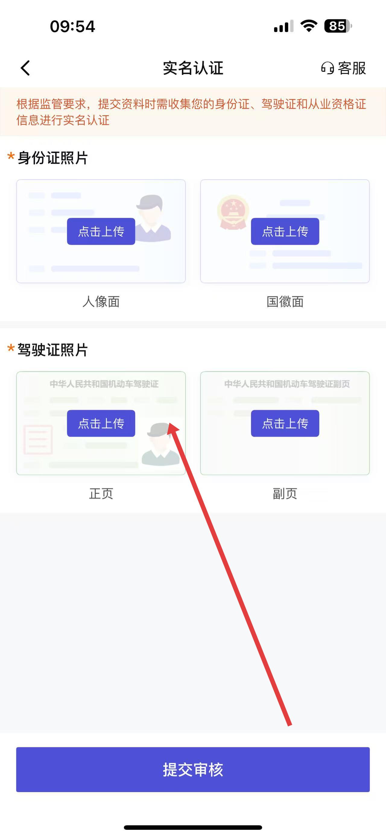 4、进入实名认证页面,按要求依次点击点击上传按钮,上传完成后点击提交审核,等待审核通过即完成实名注册。
