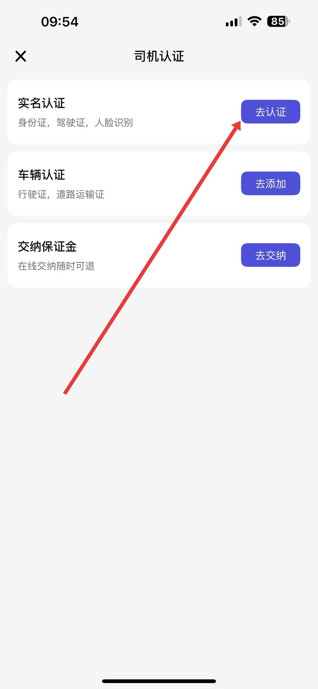 3、在司机认证页面,点击实名认证栏右侧的去认证按钮。
