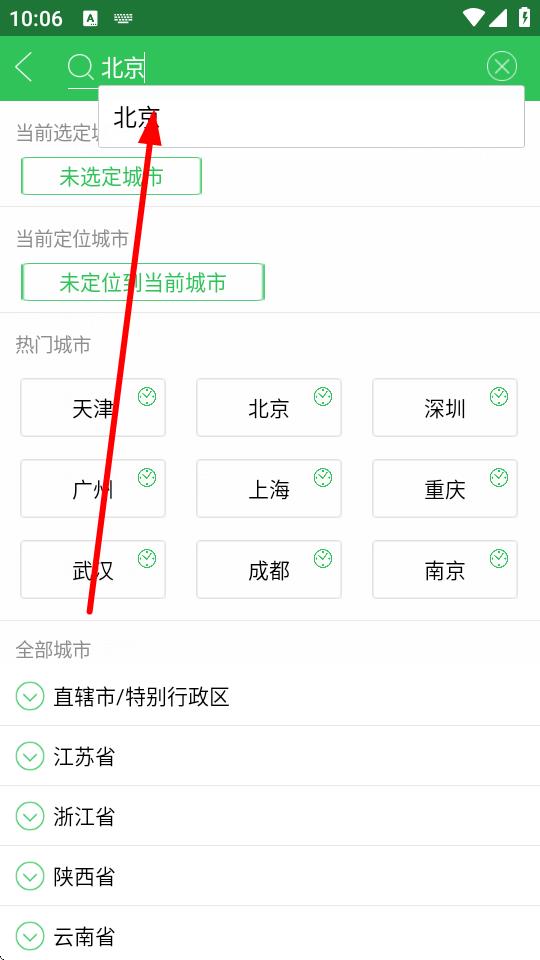4、在搜索框输入要切换的城市名称,如北京,然后点击搜索结果中的该城市,即可完成切换。