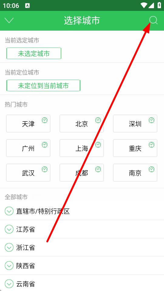 3、进入选择城市页面后,点击右上角的搜索图标。
