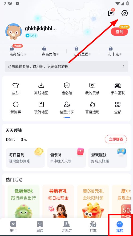 1、打开百度地图应用,点击底部导航栏中的我的,在界面右上角点击设置图标,进入设置页面。