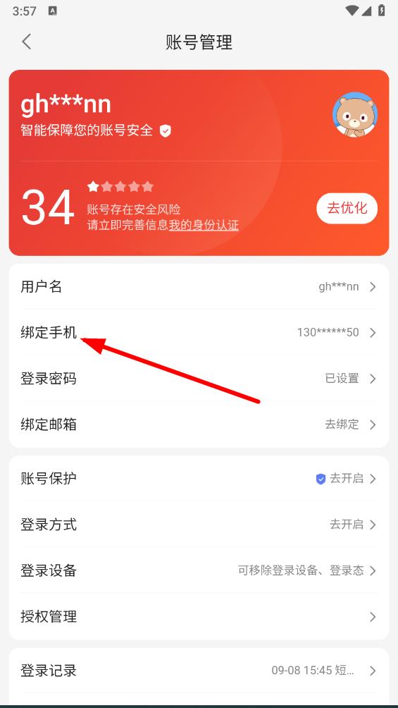 3、在账号管理界面里点击绑定手机选项,进入修改手机号页面。