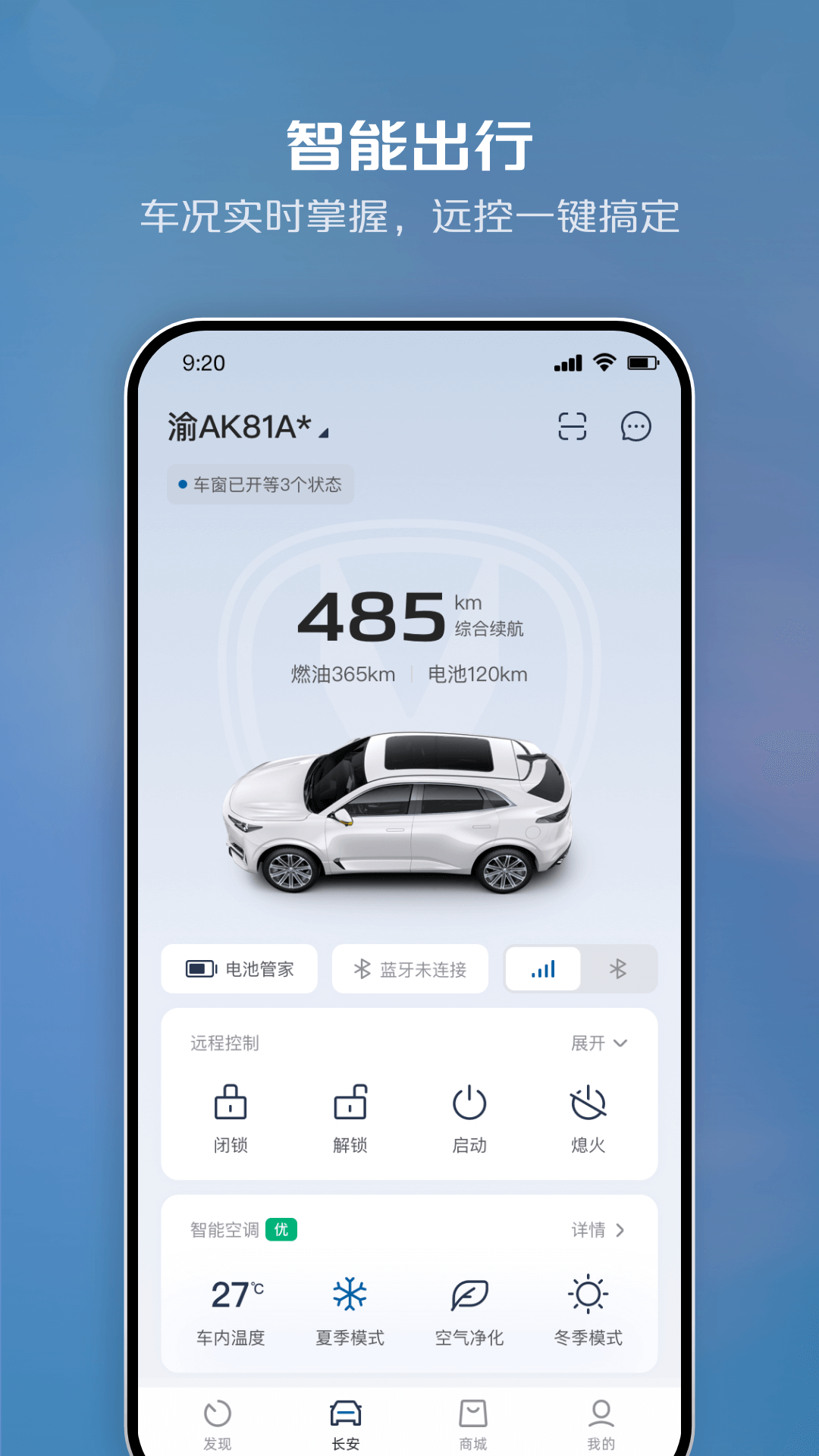 长安智慧云控EV是长安新能源汽车推出的汽车智能互联手机应用,车主可以通过手机随时掌握爱车的车辆状况、车辆电量、对车辆进行远程控制、获取车辆最新的服务信息。为车主提供智能化科技服务和个性化出行体验,方便用户更好的管理爱车。